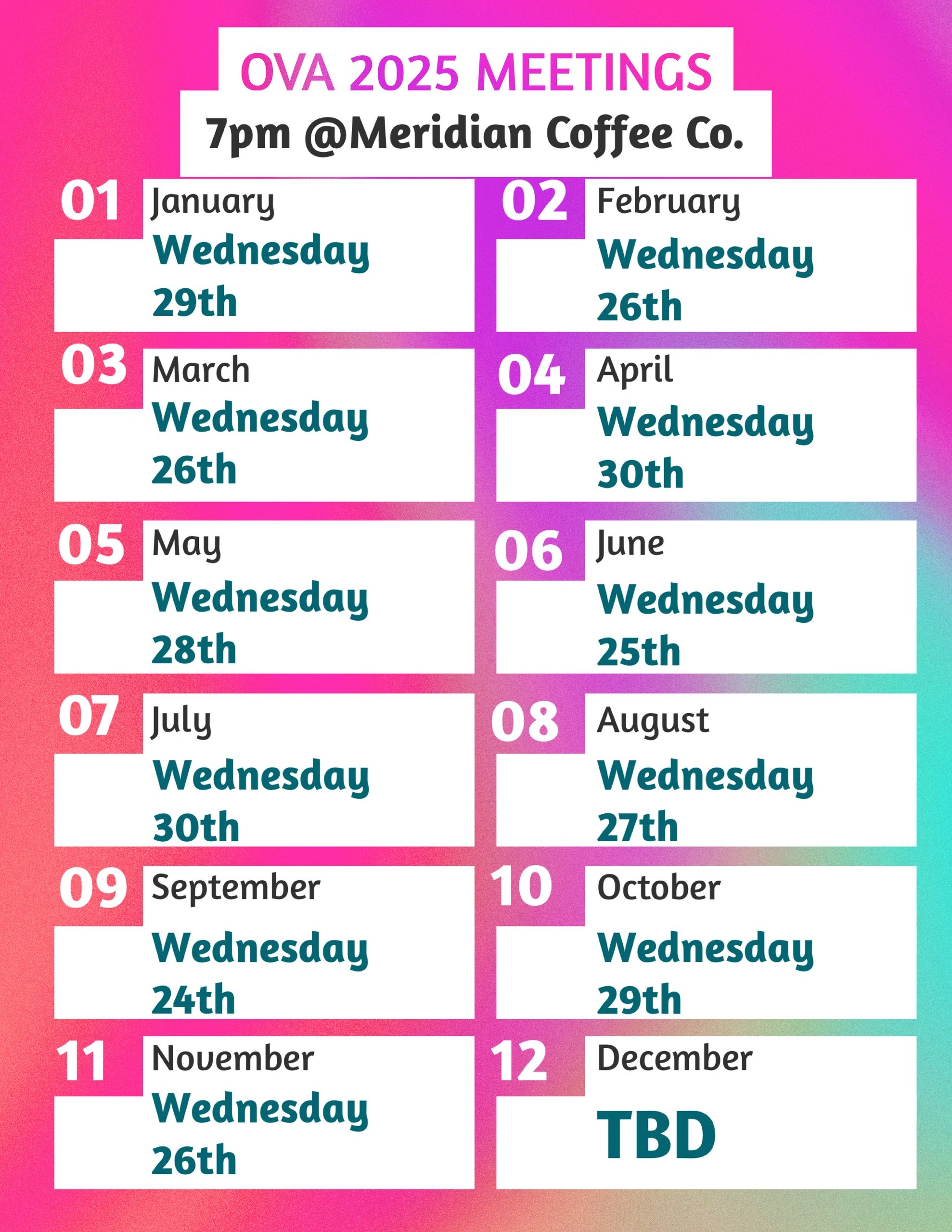the OVA meets the last Wednesday of every month at 7pm at Meridian Coffee on Starkweather. Meetings are open to all and we welcome you!